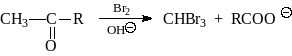 В ходе реакции в щелочных условиях метильная группа сначала полностью галогенируется, а затем происходит ацильное расщепление: