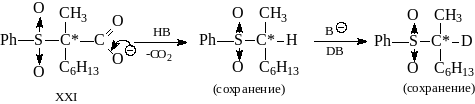 Однако некоторые карбанионы, содержащие элементы третьего периода,. сохраняют свою исходную асимметрию после отщепления СО2 даже в растворителях с высокой диэлектрической проницаемостью, в которых в обычных случаях (раздел 20.2.2) более предпочтительна рацемизация. Например, декарбоксилирование -метил--фенилоульфонилоктановой кислоты (XXI) происходит с полным сохранением конфигурационной стабильности карбаниона, поскольку изотопный обмен водорода в образовавшемся сульфоне также протекает с высокой степенью сохранения конфигурации.
