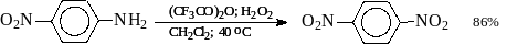 Получение ароматических нитросоединений нитрованием ароматических соединений было подробно рассмотрено в главе 13. Другой общий метод получения нитроаренов заключается в окислении первичных ароматических аминов с помощью трифторперуксусной кислоты в хлористом метилене. Трифторперуксусную кислоту получают непосредственно в реакционной смеси при взаимодействии ангидрида трифторуксусной кислоты и 90%-ой перекиси водорода. Этот метод имеет ограниченную область применения, так как ароматические амины в свою очередь обычно получают восстановлением нитросоединений. Окисление аминогруппы до нитрогруппы с помощью трифторперуксусной кислоты имеет значение для синтеза нитросоединений, содержащих в орто- и пара-положениях другие электроноакцепторные группировки: - например, для получения орто- и пара-динитробензола, 1,2,4-тринитробензола, 2,6-дихлорнитробензола и др.