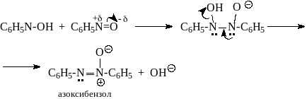 Восстановление нитросоединений металлами в щелочной среде резко отличается от восстановления в кислой среде. В щелочной среде нитрозобензол быстро взаимодействует со вторым промежуточным продуктом восстановления фенилгидроксиламином с образованием азоксибензола. Эта реакция по существу подобна присоединению азотистых оснований к карбонильной группе альдегидов и кетонов: