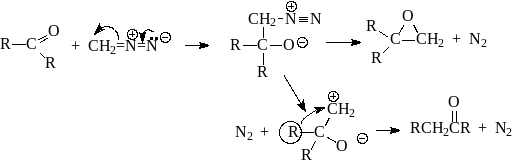 Взаимодействие альдегидов и кетонов с диазометаном представляет собой метод получения гомологов карбонильных соединений. В качестве побочных продуктов образуются оксираны. В первой стадии в результате нуклеофильного присоединения диазометана к карбонильной группе образуется бетаин. Бетаин стабилизируется двумя альтернативными путями - замыканием трехчленного цикла в результате нуклеофильной SN2-атаки кислорода по метиленовой группе с одновременным отщеплением молекулярного азота, либо за счет миграции группы R.