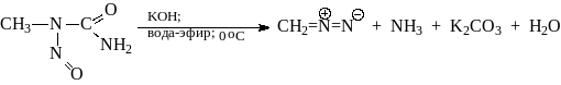 Лучшим в настоящее время способом получения диазометана остается метод, предложенный еще в 1930 году Ф.Арндтом и заключающийся в обработке N-нитрозометилмочевины концентрированным раствором щелочи.