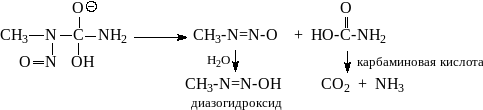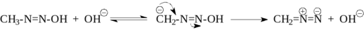 Реакция щелочного разложения включает две стадии. В первой стадии ацильный или сульфонильный остаток Y мигрирует от азота к кислороду нитрозогруппы. Далее следует депротонирование и отщепление остатка YO-. Исключительно важный в органическом синтезе диазометан