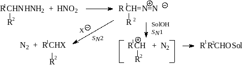 Диазокетоны и диазоэфиры гораздо стабильнее диазоалканов и легко выделяются в индивидуальном виде. Как уже было отмечено ранее в главе 21, алифатические диазониевые соли невозможно выделить в качестве стабильных интермедиатов в реакции нитрозирования первичных алифатических аминов. Диазониевые соли алифатического ряда спонтанно разлагаются с выделением азота либо в результате атаки нуклеофильного реагента по механизму SN2, либо в результате образования "горячего" карбокатиона по механизму SN1.