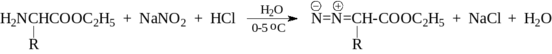 Эта реакция имеет общий характер для соединений, содержащих метиленовую группу, активированную двумя электроноакцепторными заместителями COR; COOR; NO2; CN). Диазоэфиры образуются при нитрозировании эфиров -аминокислот: