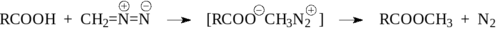 Предполагается, что в каждой из этих реакций в первой стадии происходит перенос протона к диазометану с образованием крайне нестабильного катиона метилдиазония СH3N2+, который затем взаимодействует с карбоновой кислотой или другим нуклеофильным агентом с образованием конечного продукта метилирования.