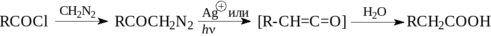 Многие реакции диазоалканов подробно описаны в других главах. Образование карбенов из диазометана и диазоуксусного эфира описано в главе 5. Перегруппировка Вольфа представляет собой превращение диазокарбонильных соединений в кетены, катализируемое ионами серебра или облучением. Эта перегруппировка лежит в основе общего метода синтеза карбоновых кислот по Арндту-Эйстерту, рассмотренного в главе 18.