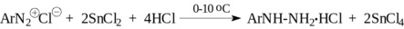 Другой способ восстановления солей диазония в арилгидразины был разработан В.Мейером (1883 год) и состоит в восстановлении солей диазония двухлористым оловом в соляной кислоте.