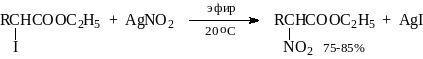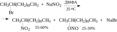 Третичные алкилгалогениды подвергаются элиминированию вод действием нитрит-иона и не образуют нитросоединений. Эфиры хлор- или -бромзамещенных кислот гладко превращаются в эфиры нитрозамещенных кислот с выходом 60%-80% при взаимодействии с нитритом натрия в ДМФА или ДМСО.