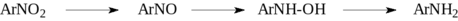 Суммарный процесс восстановления ароматических нитросоединений металлами в кислой и щелочной среде может быть представлен в виде следующей последовательности превращений:
