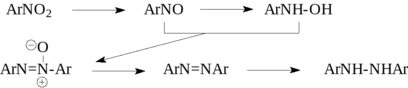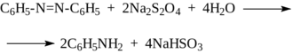 Азобензол восстанавливается цинковой пылью и спиртовой щелочью до гидразобензола. Гидразобензол является, таким образом, конечным продуктом восстановления нитробензола металлом в щелочной среде. На воздухе бесцветный гидразобензол легко окисляется до окрашенного в оранжево-красный цвет азобензола. Вместе с тем, гидразобензол, также как и азобензол и азоксибензол восстанавливается до анилина под действием дитионита натрия в воде или хлоридом олова (II) в соляной кислоте: