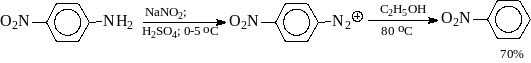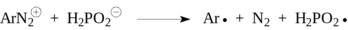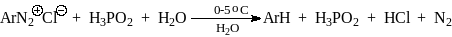 Согласно стехиометрическому уравнению для восстановления требуется эквимолярное количество фосфорноватистой кислоты, практически для достижения хорошего выхода продукта замещения диазогруппы на водород требуется пятикратный избыток Н3РО2. Реакцию проводят, используя 30-50%-ый водный раствор Н3РО2 при 0°-5° в течение 24 часов. Выход конечного продукта восстановления колеблется в интервале 60-80%. Замещение диазогруппы на водород с помощью Н3РО2, по-видимому, также идет по радикальному механизму, который может быть выражен следующей последовательностью превращений: