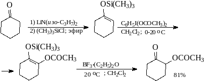 Иодозобензолдиацетат и иодозобензолбистрифторацетат являются эффективными агентами ацетоксилирования карбонильных соединений в положение к карбонильной группе, например: