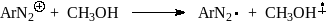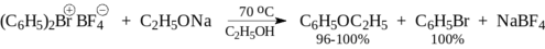 Эта реакция, также как и взаимодействие катиона диазония с водой, протекает по гетеролитическому мономолекулярному механизму. Однако образование арилалкиловых эфиров всегда сопровождается конкурирующей окислительно-восстановительной реакцией замещения диазогруппы на водород.