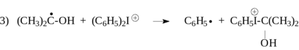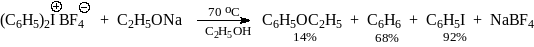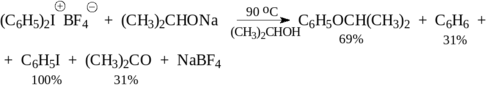 Взаимодействие солей иодония с алкоксид-ионами,несомненно, протекает по радикальному механизму, поскольку основным продуктом оказывается бензол и карбонильное соединение, образующиеся, вероятно, в результате следующей последовательности превращений: