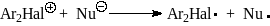 SRN1 Механизм нуклеофильного ароматического замещения наиболее вероятен для реакций солей диарилгалогенония с мягкими нуклеофильными агентами - енолят-ионами, тиоцианат-, сульфинат-ионами и др. мягкими основаниями Льюиса. Катион Ar2Hal+ является сильным одноэлектронным окислителем, поэтому для реализации ион-радикального цепного процесса нет необходимости в инициировании реакции УФ-светом, которое обязательно для нуклеофильного SRN1 замещения галогена в а-рилгалогенидах.