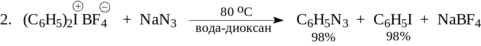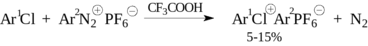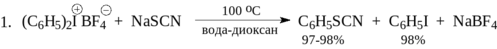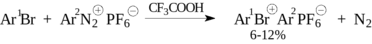 Хлорбензол, бромбензол, иодобензол и их производные, содержащие в кольце электронодонорные или электроноакцепторные заместители, арилируются по атому галогена при взаимодействии с солями арендиазония в трифторуксусной кислоте с образованием галогенониевых солей.