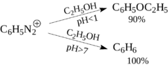 В некоторых случаях соотношение продуктов можно полностью изменить при варьировании рН раствора. Так, например, при разложении катиона бензолдиазония в сильнокислой среде в этаноле получается фенетол с 90% выходом, тогда как в ацетатном буфере с количественным выходом образуется бензол.