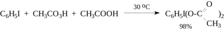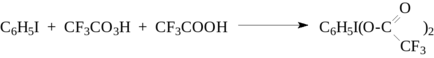 Аналогично получается и другой важный реагент иода (III) - иодозо-бензолбистрифторацетат, фенилиодозодиацетат при щелочном гидролизе дает иодозобензол с превосходным выходом, а при взаимодействии с п-толуолсульфокислотой превращается в фенилиод (III) окситозилат (иодозобензолгидрокситозилат).