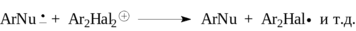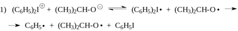 По аналогии с солями диазония можно предположить, что по крайней мере в ряде случаев, и здесь реализуется SRN1-механизм Баннета-Корнблюма, который в данном случае может быть выражен с помощью следующих уравнений ион-радикального цепного процесса: