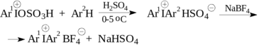 Соли диарилиодония получают, используя в качестве исходного реагента иодозобензол. Иодозобензол в серной кислоте превращается в иодозобензолбисульфат (фенилиод (III) сульфат). Катион ArI+-OSO3H выполняет роль электрофильного агента в конденсации с ароматическими углеводородами по типу реакции Фриделя-Крафтса: