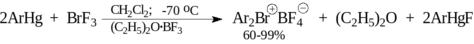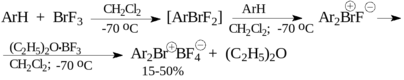 Так получают соли диарилхлорония и диарилбромония, хотя их выходы не превышают 15-20%. Наиболее универсальным способом получения диарилбромониевых солей является конденсация ароматических углеводородов и из производных с трифторидом брома в условиях реакции Фриделя-Крафтса: