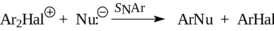 Для реакций, в которых под действием нуклеофильного агента в галогенониевых солях Ar2Hal+ происходит замещение ArHal на нуклеофил Nu, предполагается SNAr механизм замещения, хотя убедительных доказательств этого не имеется.