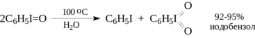 Иодозобензол термически не стабилен и при нагревании до 100°С в воде диспропорционирует с образованием иодобензола и иодбензола (иодилбензола).