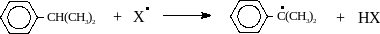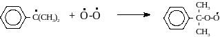 Эта реакция протекает по цепному, радикальному механизму с участием кумильного радикала. Инициатор радикального превращения отщепляет атом водорода из бензильного положения кумола с образованием достаточно стабильного третичного кумильного радикала. Этот радикал далее реагирует с кислородом с образованием нового перекисного радикала, который отщепляет атом водорода от исходного кумола с регенерацией кумильного радикала.