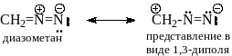 Заметим, что в реальной электронной конфигурации диазометана полного разделения зарядов не происходит. На самом деле углерод несет лишь частичный положительный, а азот лишь частично отрицательный заряды; поэтому схему реакции можно записать и по другому: