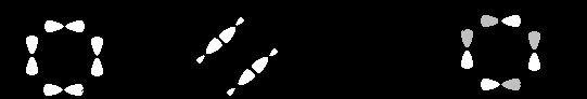 Сохранение орбитальной симметрии. В методе корреляционных диаграмм рассматривается изменение энергии перициклических орбиталей при превращении реагентов в продукт реакции. В качестве простого примера рассмотрим методику построения корреляционной диаграммы для реакции (2s+2s)-циклоприсоединения между двумя молекулами этилена с образованием циклобутана. Под реагентом условимся понимать пару сближающихся молекул этилена, ориентированных друг над другом в двух параллельных плоскостях, в этом случае орбитальный базис реакции, который, по определению, должен включать орбитали рвущихся и образующихся связей, выглядит следующим образом: