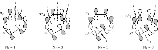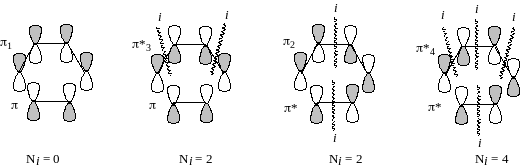 Третий подход к объяснению разрешенности или запрещенности перициклических реакций основан на представлении циклического переходного состояния как ароматической или антиароматической системы. Еще в 1939 г. М.Эванс заметил, что циклическое переходное состояние реакции Дильса-Альдера удивительно напоминает молекулу бензола. Разница состоит лишь в том, что в плоской молекуле бензола молекулярные -орбитали образуются путем бокового перекрывания орбиталей С2р, а в переходном состоянии реакции Дильса-Альдера две из шести АО перекрываются вдоль своих осей. По существу, переходное состояние реакции Дильса-Альдера - это молекула бензола, в которой отсутствуют, кроме того, две скелетные -связи. Такие системы называются изосопряженными.