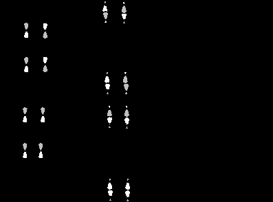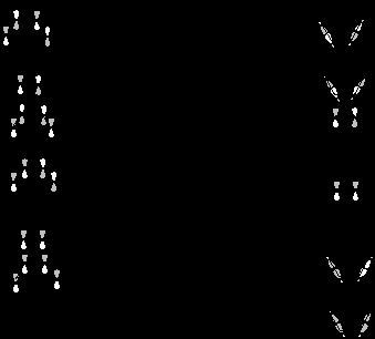 Теперь рассмотрим реакции, в которых один из реагентов реагирует супраповерхностно, а второй антараповерхностно, т.е. (4s + 2a), (4a + 2s) и (2s + 2a)-циклоприсоединение. Применяя правило отбора по симметрии, получаем следующие значения числа инверсий фазы.
