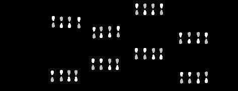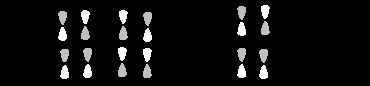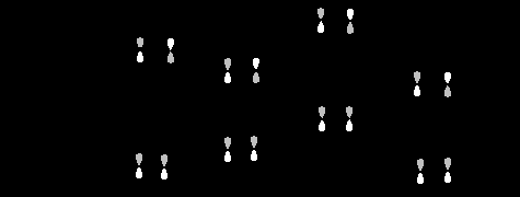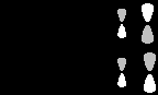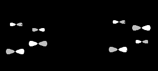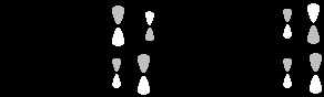 Приведенные схемы отличаются тем, что в первом случае (слева) взаимодействуют два атома с большими орбитальными коэффициентами и два атома с малыми коэффициентами, тогда как во втором случае (справа) атомы с большими коэффициентами взаимодействуют с атомам с малыми коэффициентами. Выписав числитель в выражении для E (уравнение 25.5) при взаимодействии "голова к голове"
