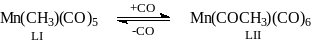 В качестве примера рассмотрим метилпентакарбонилмарганец (LI). В бензольном растворе в атмосфере СО это соединение находится в равновесии с ацетилпентакарбонилмарганцем (LII):