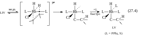 Пустое координационное место, образующееся в ходе реакции (27.3), может быть занято растворителем или другим лигандом, присутствующим в растворе. Следовательно, реакции внедрения благоприятствуют хорошо координирующиеся растворители (эфир, ТГФ) или присутствие таких хороших лигандов, как СО или PR3. Этот фактор всегда учитывают при создании новых каталитических систем.