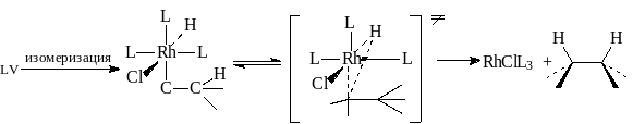 В конечном продукте этой реакции (LV) гидридная к алкильная группы находятся взаимно в транс-положении, поэтому перед заключительной стадией реакции комплекс LV сначала изомеризуется в цис-форму:
