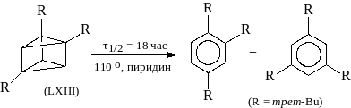 Такие реакции катализируются не только переходными металлами, но, вообще, любыми кислотами Льюиса. Так, призман LXIII превращается в 1,2,4-замещенный бензол (без примеси 1,3,5-изомера, как в реакции 27.5 с АgI) даже при действии 0.003 М HCl (1/2 = 35 мин). Для изомеризации призмана определяющеей каталитическую активность является кислотность катализатора по Льюису. Эту реакцию катализируют самые разнообразные катализаторы: Hg(II), Sn(II), Рb(II) и даже 1,3,5-тринитробензол.