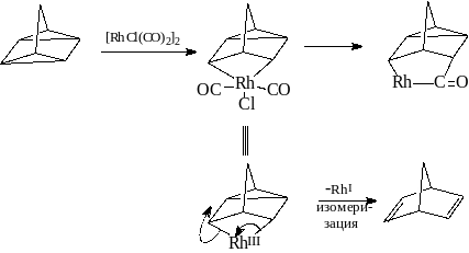 Аналогичный механизм предложен для катализируемых Rh (I) или Rh (III) изомеризацик кубана и гомокубана.