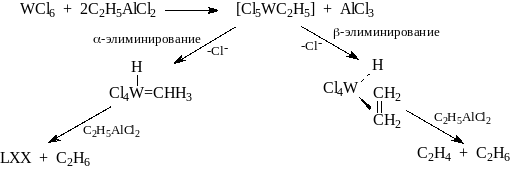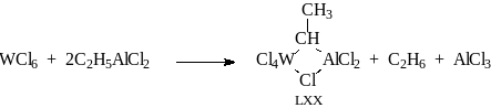 Комплекс LXX в дальнейшем реагирует в виде Cl4W=CHCH3, т.к. в растворе этот комплекс в какой-то степени диссоциирует с отщеплением хлорида алюминия. Алкилиденовый комплекс образуется из первоначального алкильного комплекса в результате процесса -элиминирования (см. раздел 27.8.4.1).