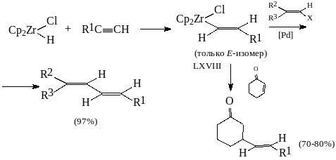 (Е)-Алкенильные комплексы циркония, получаемые реакцией алкинов с Cp2Zr(H)Cl, в присутствии палладиевых катализаторов реагируют с алкилгалогенидами, образуя с хорошими выходами изомерно чистые (97%) диены. Комплекс LXVIII с точки зрения выхода и стереоселективности так же хорош, как и соединения алкенилалюминия (гл.19, раздел 19.3) и обладает тем преимуществом, что кислородные функции, например, эфирная или кетонная группы, в процессе реакции не затрагиваются.