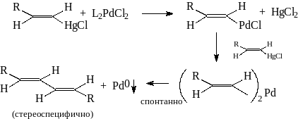 В полярных координирующих растворителях эти комплексы реагируют со многими органическими галогенидами, образуя замещенные алкены, например: