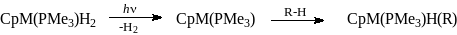 Действительно, алкилгидридные и арилгидридные комплексы были получены из алканов или ароматических углеводородов в системах, содержащих металлоорганические соединения типа СрМ(РМе3)Н2 или (5-C5Me5)M(PMe3)H2 (M = Rh, Ir). При облучении УФ-светом происходит отщепление молекулы Н2, и активный 16-электронный интермедиат CpМ(РМе3) внедряется в связь С-Н углеводорода, образуя соединение СрМ(РМе3)Н(R).