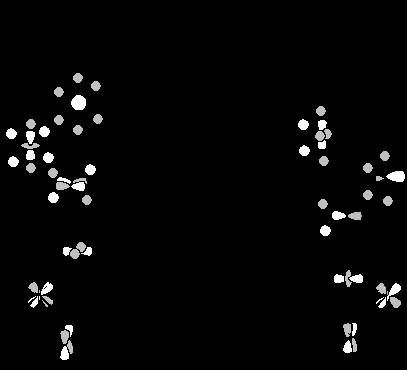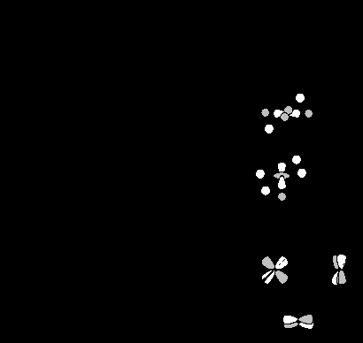Удаление двух цис-лигандов не возмущает орбитали и (рис.27.2). В то же время орбитали и стабилизуруются в результате того, что при удалении двух лигандов в них утрачиваются по два антисвязывающих взаимодействия металл-лиганд. В результате получается картина, приведенная на рис. 27.7. Орбитали ’ и ’ лежат ниже орбитали’. Они являются гибридными и их большие доли направлены в сторону несвязывающих лигандов (ср. с формулой XXIII). Гибридизация происходит путем смешивания c орбиталями (рис.27.2).