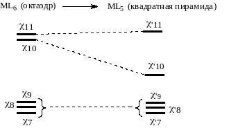 Таким образом, при переходе от октаэдрического комплекса МL6 к квадратно-пирамидальному фрагменту ML5 энергия четырех граничных уровней не изменяется, и происходит только понижение уровня Это можно представить следующей схемой: