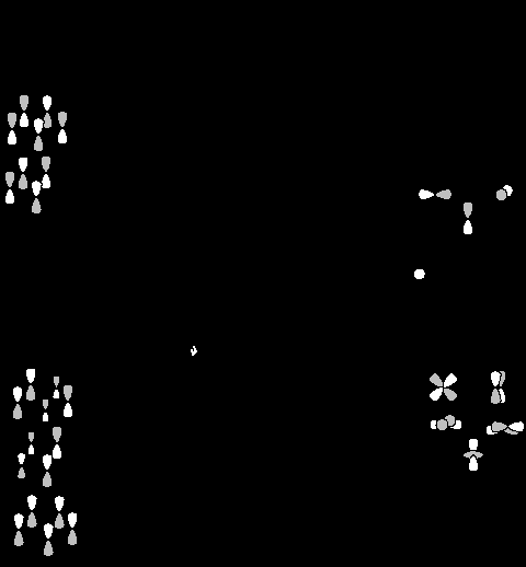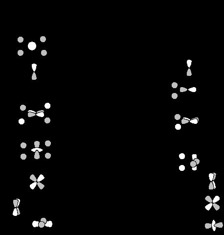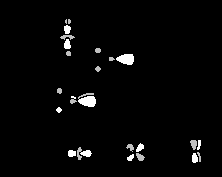 Молекулярные орбитали этого фрагмента показаны на рис. 27.9. Основные изменения происходят с орбиталями 9 и 11. Обе орбитали наполовину теряют антисвязывающий характер (так как удалены два из четырех лигандов), и поэтому их энергия значительно понижается. При образовании орбитали 11’ происходит смешивание s-орбитали металла с px-орбиталью, в результате чего возникает гибридная орбиталь, которая взаимодействует с оставшимися двумя лигандами связывающим образом, что сильно понижает энергию 11’. Орбиталь dx2-y2 в ML4 становится орбиталью dx2 в МL2, dz2-орбиталь металла в 8 переходит в dy2-z2 в 8’(ср. рис.27.6). Благодаря такому перераспределению d-функций достигается минимальное антисвязывание между орбиталями металла и лигандов в 8’ и максимальное связывание в 5.