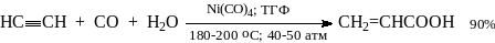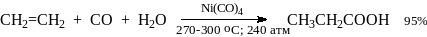 В качестве катализатора наиболее эффективен карбонил никеля, который получается непосредственно в процессе реакции из бромида никеля NiBr2 и иодида меди (I) Cu2Br2. Именно такая технология была запатентована и применяется фирмой ВАSF для промышленного получения акриловой кислоты из ацетилена на установке мощностью 130000 тонн в год. Суммарная мощность мирового производства акриловой кислоты по Реппе составляет ежегодно около 500000 тонн. В настоящее время для производства акриловой кислоты предпочитают иной путь, основанный на каталитическом окислении пропилена, описанный в разделе 28.3.7 этой главы. Промышленное производство насыщенных карбоновых кислот гидрокарбок-силированием алкенов не получило еще широкого применения. В настоящее время освоено производство пропионовой кислоты из этилена, объемом в 50000 тонн ежегодно.