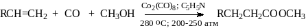 Этот метод экономически выгоднее двухстадийного способа получения пропионовой кислоты гидроформилированием этилена с последующим окислением пропионового альдегида. Реакция алкоксикарбонилирования алкенов-1 С8-С15 используется в ограниченной степени для получения эфиров жирных кислот.