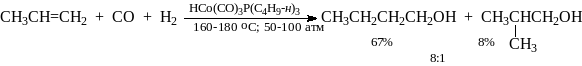 Гидроформилирование алкенов в классических условиях Релена на немодифицированном кобальтовом катализаторе требует применения высокого давления в 200-300 атм и не отличается высокой региоселективностью. Соотношение нормальных и изомерных форм альдегидов RСН2СН2CНО и RСН(CH3)СНО обычно изменяется в диапазоне от 2:1 до 4:1 при парциальном давлении СО 200-300 атм. Этот недостаток удалось преодолеть при использовании катализаторов, модифицированных третичными фосфинами, трибутилфосфином или трифенилфосфином. Эти фосфины выполняют роль лигандов, которые делают катализатор более стабильным и селективным. Модифицированные фосфинами катализаторы позволяют осуществлять прямой синтез нормальных спиртов из алкенов-1, т.е. фактически позволяет объединить в одну стадию процессы гидроформилирования алкенов и гидрирования образующихся при этом альдегидов. В одном из распространенных вариантов этого процесса, разработанного фирмой "Shell", в качестве катализатора применяют комплекс НСо(СО)3Р(С4Н9-н)3. На этом катализаторе пропилен дает смесь н-бутанола и изобутилового спирта в соотношении 8:1.