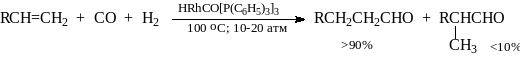 Этот комплекс кaтализирует гилроформилирование алкенов даже при атмосферном давлении, однако в промышленности его проводят при 10-100 атм и 60-100oС. Селективность по альдегидам нормального строения достигает 12:1.
